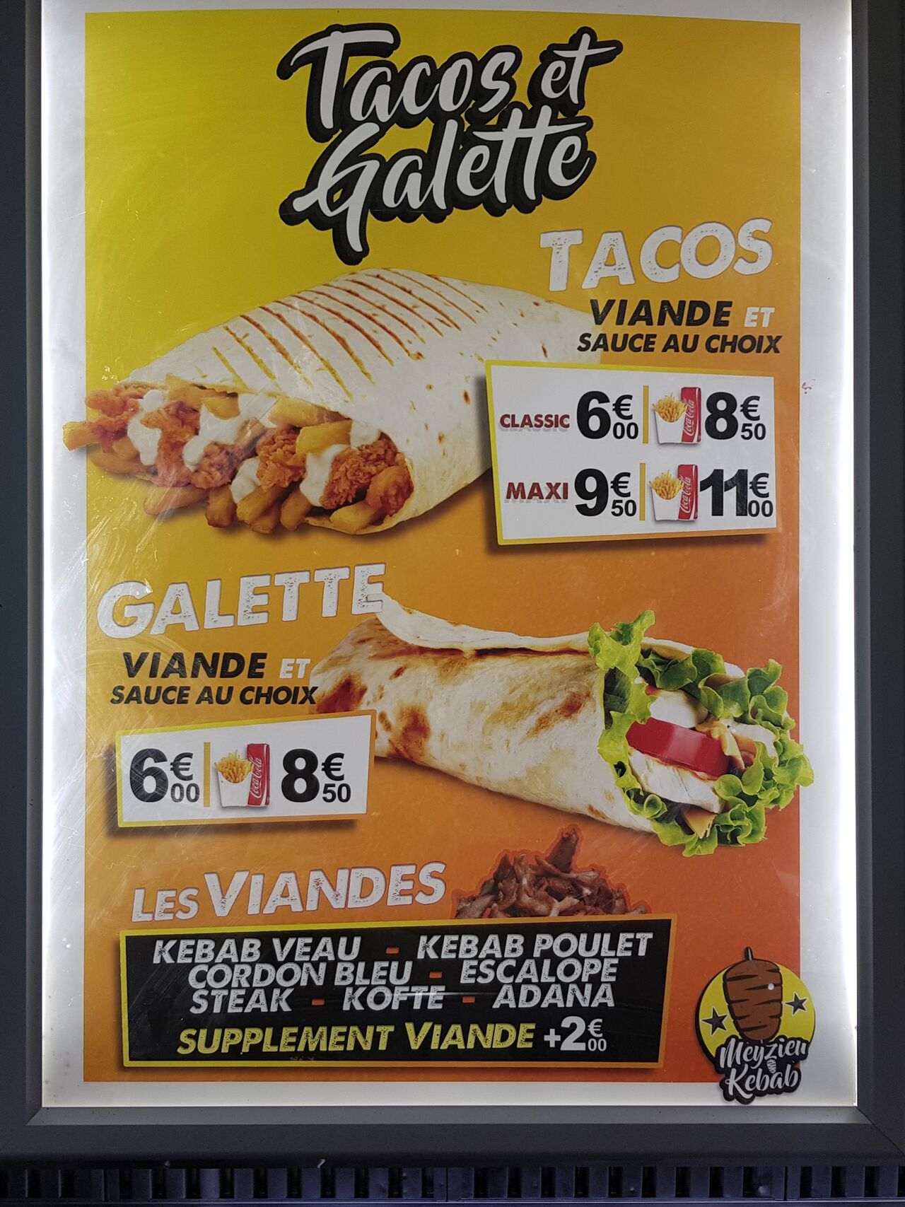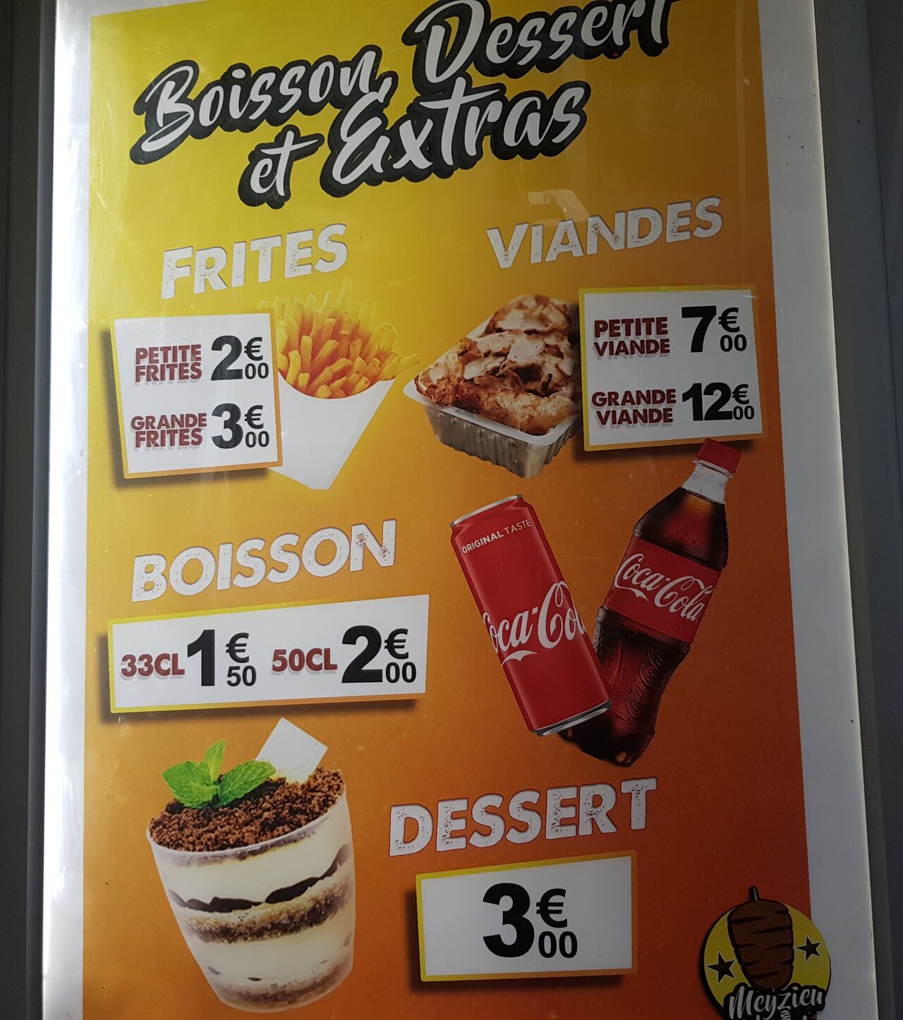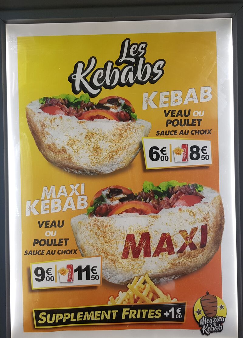 Les viandes pour les assiettes sont: kebab veau ou poulet, escalope, Kofte, cordon bleu, steak, brochette agneau(+2€)